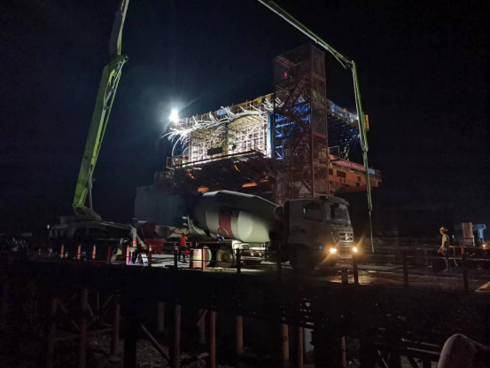 据项目负责人介绍,此次浇筑完成的标段最大跨度60+2*90+60米连续箱梁右幅83号主墩0号块,长12米、高5.5米,宽16.55米,混凝土使用方量为433.6立方米,采用支架现浇的施工工艺,施工过程中存在浇筑难度大、施工时间长、安全风险高等情况。该连续梁“0号块”顺利浇筑完成,标志着东阳特大桥转入上部结构施工阶段。为了确保此次连续梁0号块顺利浇筑,在ok138cn太阳集团古天乐的统一部署下,施工单位精心组织,多次进行施工技术交底,明确从支架搭设到模板安装、钢筋帮扎等各个工序、环节的技术规程和操作规范,确保浇筑过程中的安全质量有序可控。