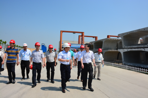 上午10点,周智安一行来到我司梁场生产基地,首先对梁场整体建设进行了观摩,然后重点参观了基地钢筋车间及宣讲台等地,并与一线生产者们进行了亲切交谈。进入梁场后,周智安一行在钢筋车间门口简单驻足,观看了工业化公司预制梁生产技术宣传片,然后步行穿过了基地的两个钢筋生产车间,仔细观看了基地党员示范牌、“三风”宣传板、安全宣讲台等设施,详细听取了城建工业化公司董事长程志华关于“三风”活动开展和梁场生产情况的介绍,热情询问了公司在“三风”活动建设、“工匠精神”树立等情况。