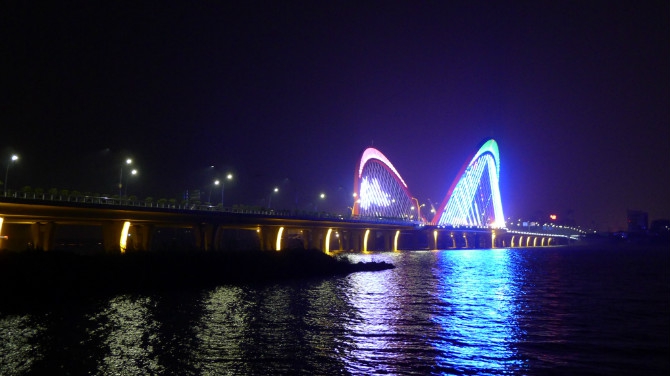 工程主体为主桥、东引桥、西引桥三大部分。主桥为30米+108米+30米三跨连续外倾式四索面下承式钢箱系杆拱桥,以对称倾斜拱结构与桥外伸出的半圆人行道相对,寓意“张开双臂,拥抱蓝天”,也预示南昌市美好的未来与日同辉。工程总投资约5.98亿元。工程于2010年5月7日开工,于2011年9月9日竣工通车。